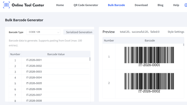 Excel သို့မဟုတ် CSV မှ ဘာကုဒ်များစွာကို အများအပြား ထုတ်လုပ်ပါ။ Code 128, EAN-13, UPC-A နှင့် ပုံနှိပ်ရန် အဆင်သင့်သော တင်ပို့ပုံစံများကို ထောက်ပံ့သော အခမဲ့ အွန်လိုင်း ဘားကုဒ်မျိုးစုံ